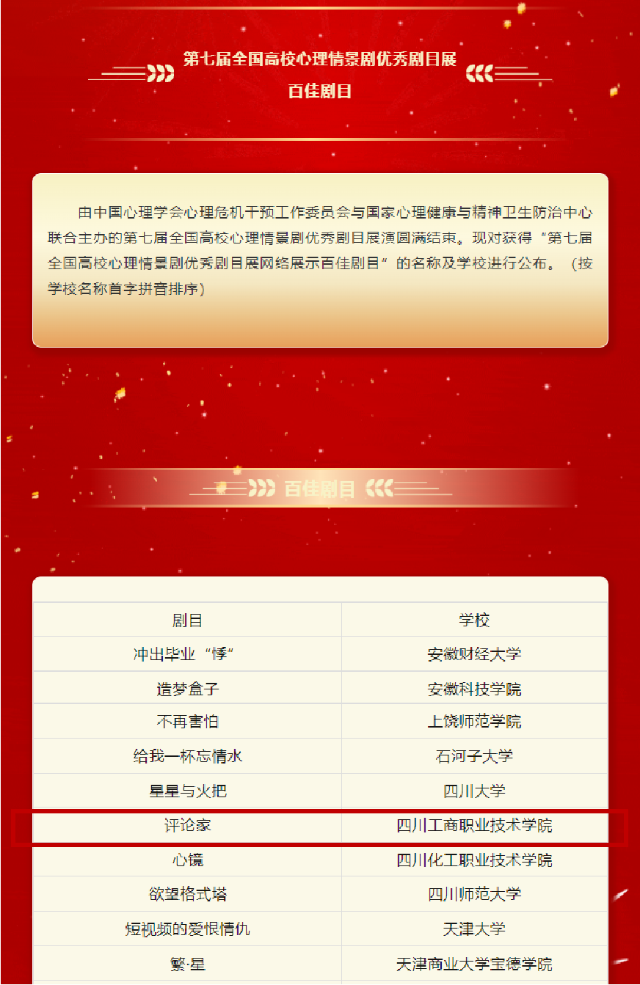 来自全国280余所高校的心理情景剧作品展开激烈角逐,我校心理情景剧剧目《评论家》经过网络评比和专家评分两个环节的评比,跻身第七届全国高校心理情景剧展演百佳剧目。